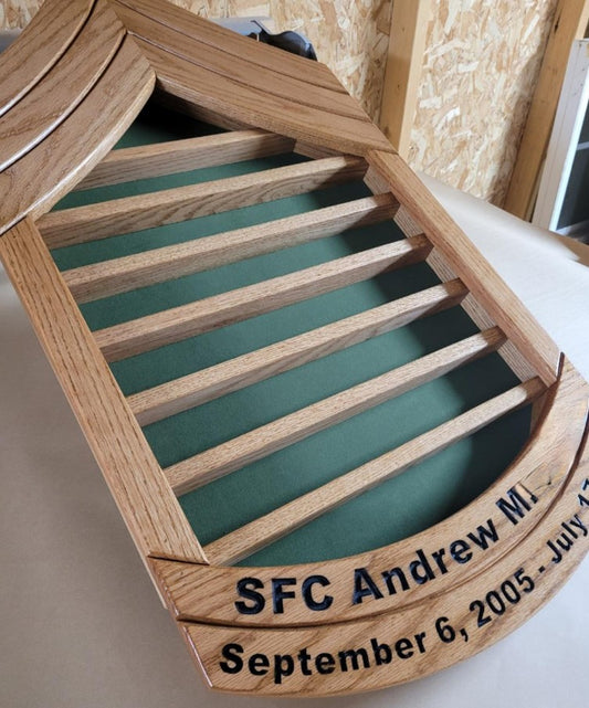 We specialize in the design and construction of shadowboxes, flag cases, coin displays, awards and Recognition plaques for our military brothers and sisters and take great pride in creating special ways to commemorate their service to our country.